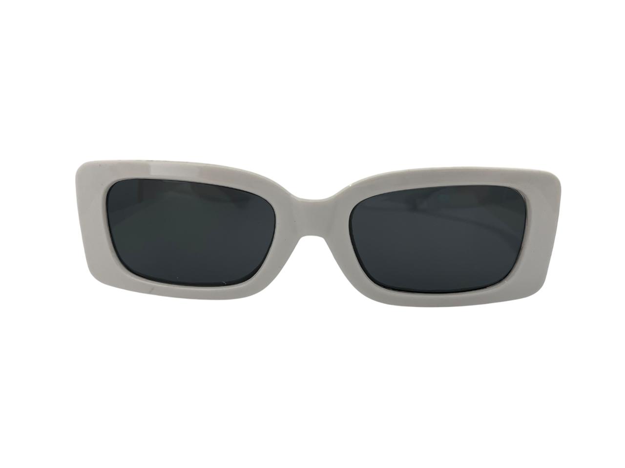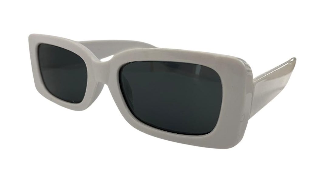 Montura blanca de diseño rectangular con acabado brillante y lentes oscuros. Su estilo minimalista y moderno aporta un toque sofisticado y versátil, ideal para quienes buscan un accesorio elegante y distintivo.