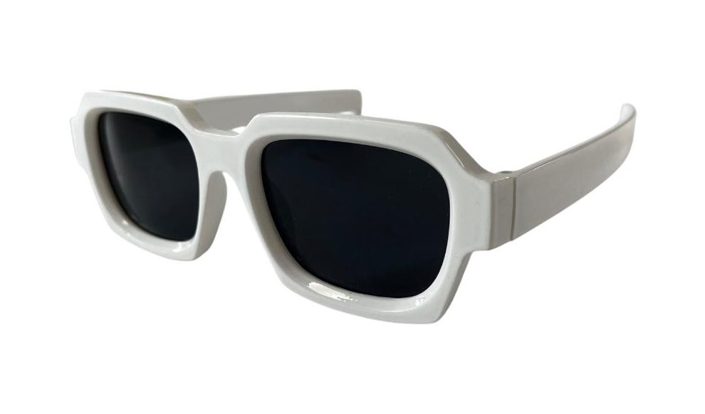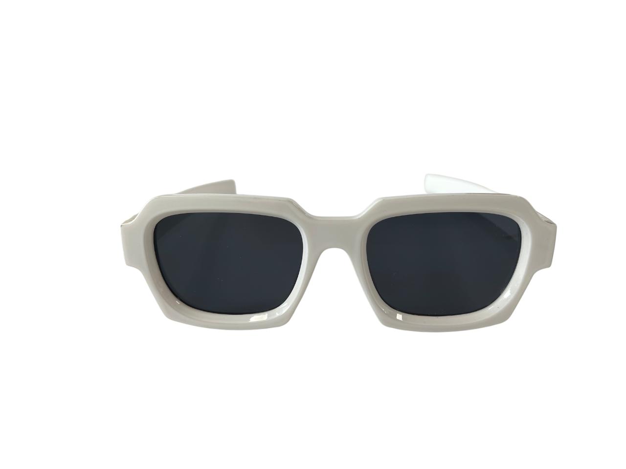 Gafas de sol con montura blanca y lentes oscuras. El diseño tiene una forma rectangular con bordes ligeramente redondeados, creando un look moderno y estiloso, perfecto para quienes buscan un accesorio de moda llamativo.