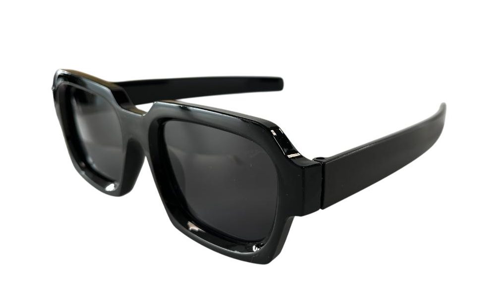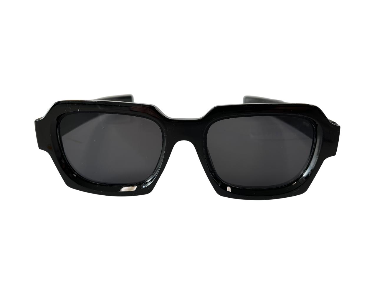 Gafas de sol con montura negra gruesa y lentes oscuras. Diseño rectangular y moderno con acabado brillante en la montura. Las patillas son gruesas y rectas, ofreciendo un look elegante y sofisticado.