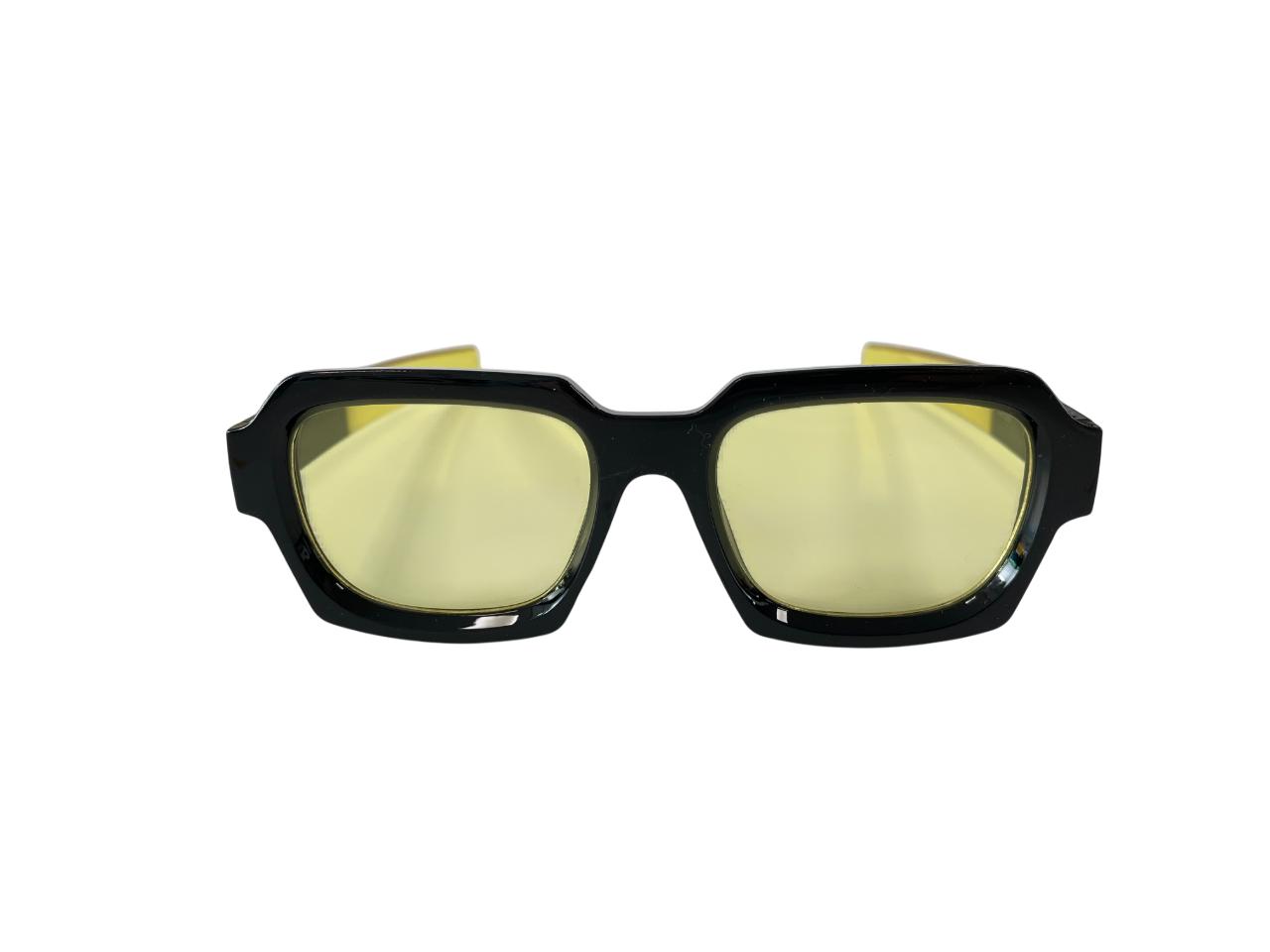 Gafas de sol con montura negra y lentes amarillas. Las patillas tienen un acabado en el mismo tono que las lentes, creando un diseño audaz y moderno. Las lentes amarillas ofrecen un contraste y estilo únicos, perfectas para destacar.