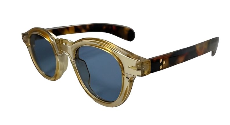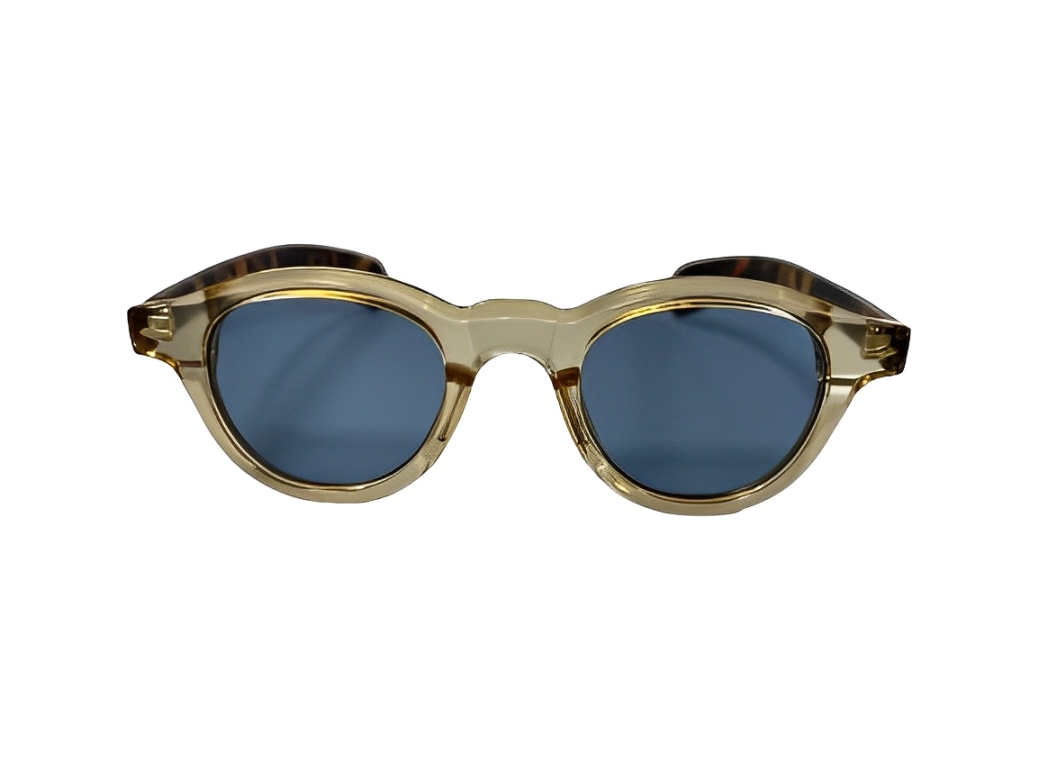 Montura con una combinación de color champán transparente con patillas de carey, creando un estilo único y sofisticado. Con sus lentes en tono azul, este modelo es ideal para quienes buscan un diseño elegante con un toque retro.