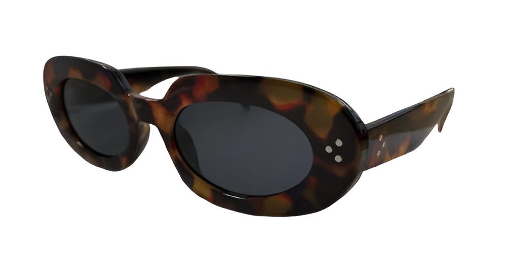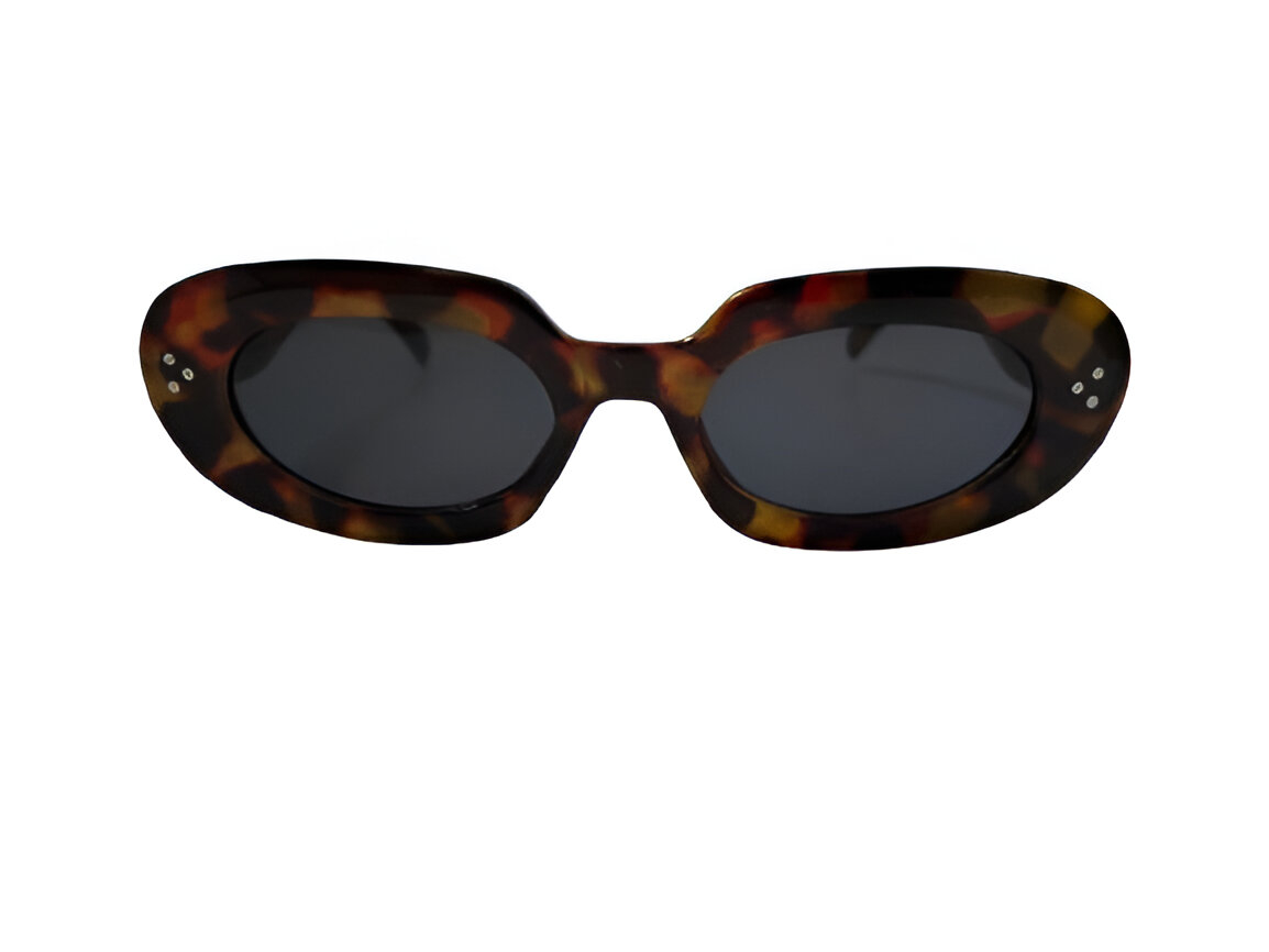 Gafas de sol con montura de carey y lentes oscuras. Diseño elegante y atemporal con un patrón de carey en tonos marrón y ámbar. La forma ovalada y los detalles en la montura aportan un toque sofisticado. Perfectas para complementar cualquier estilo con protección UV.