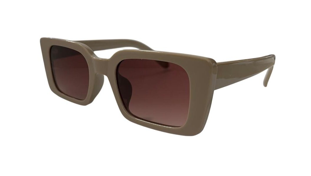 Montura beige con lentes ahumadas rectangulares. Su diseño limpio y sofisticado aporta un estilo elegante y versátil, ideal para quienes buscan un look moderno y minimalista.