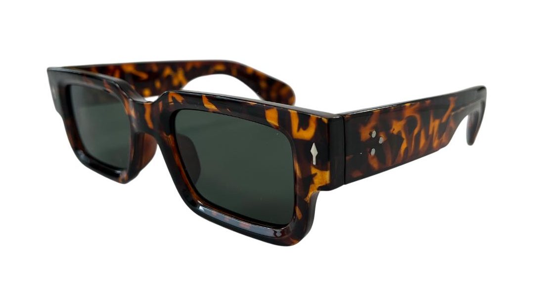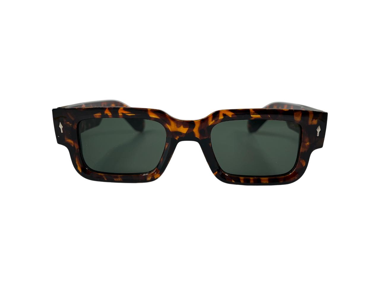 Gafas de sol con montura en patrón de carey, que combina tonos marrones y negros. Lentes oscuras en un tono verdoso para una protección eficaz contra los rayos UV. Diseño cuadrado y elegante, perfecto para un look sofisticado.