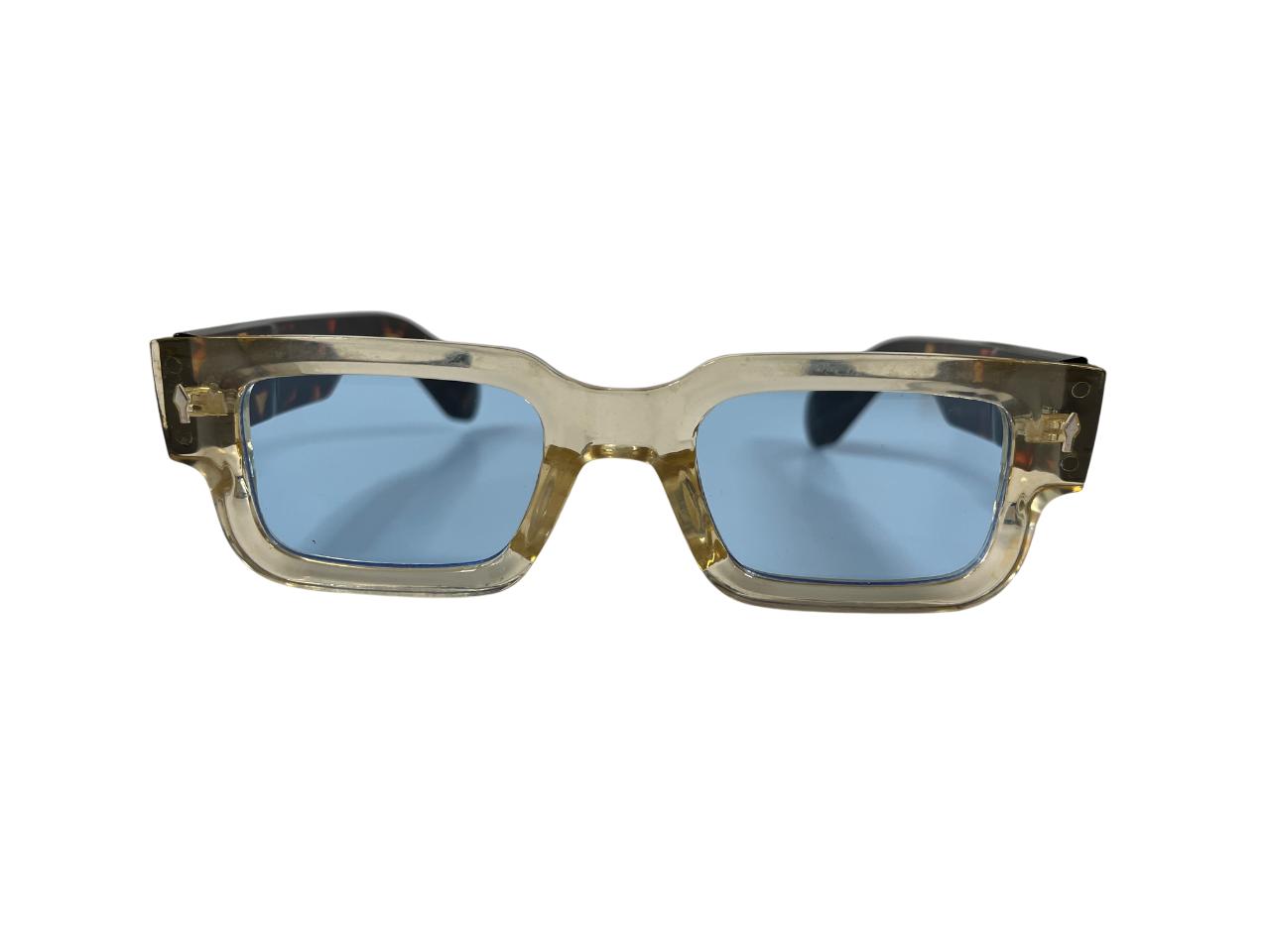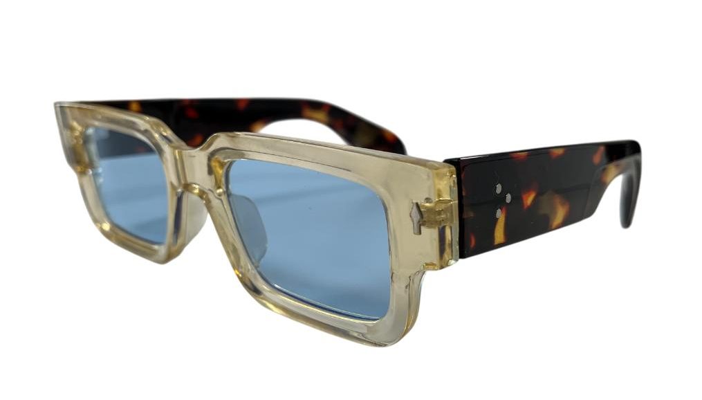 Gafas de sol con montura transparente ligeramente amarillenta y lentes tintadas en celeste. Las patillas tienen un diseño de carey con tonos marrones y claros. Unas gafas modernas y elegantes, perfectas para añadir un toque de estilo.