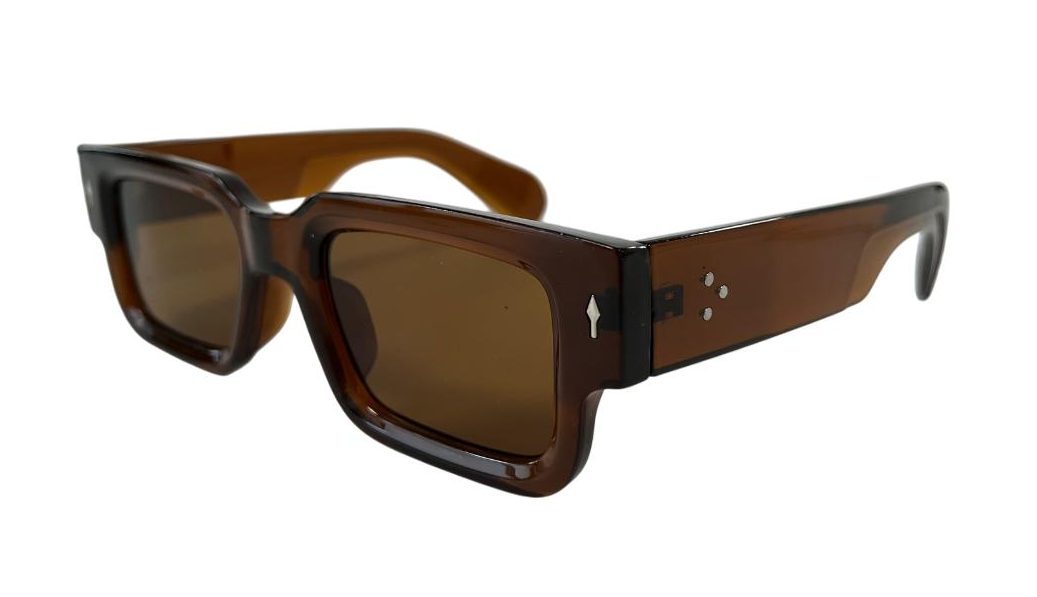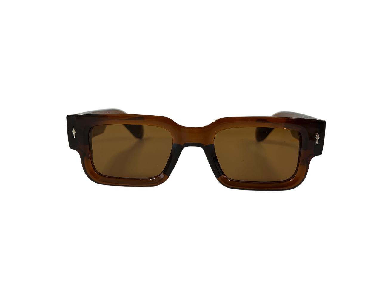 Gafas de sol con montura rectangular marrón y lentes en tono caramelo. La montura es gruesa y tiene un acabado brillante. Diseño moderno y elegante.