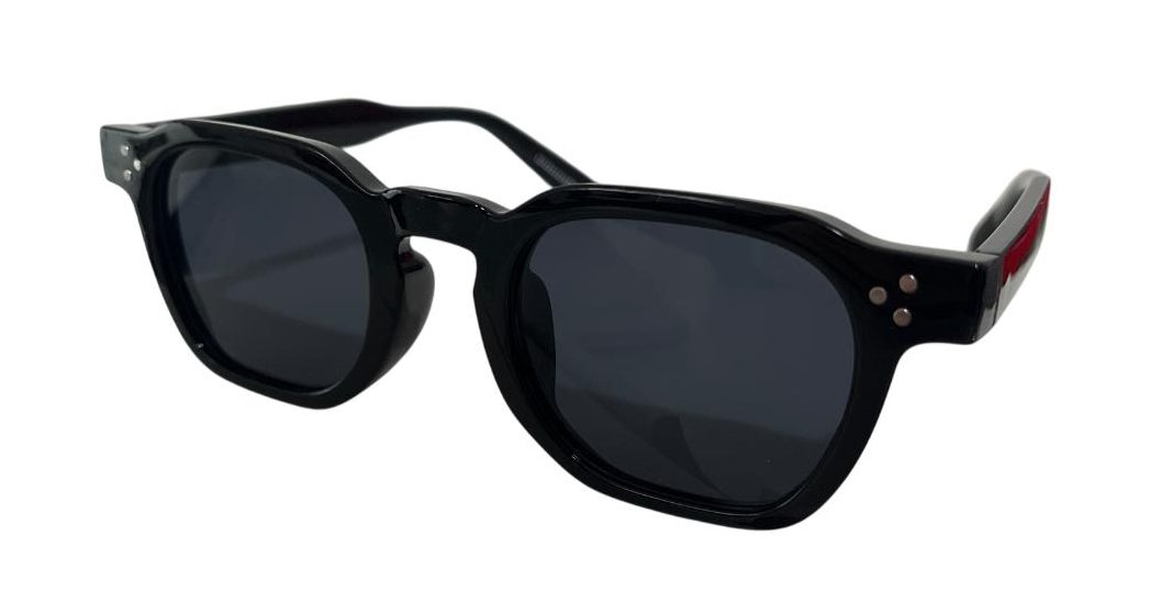 Sólidas y modernas: gafas de sol rectangulares en negro brillante con lentes oscuras. Su diseño robusto con bordes redondeados y detalles metálicos en las esquinas aporta carácter y sofisticación. Las patillas con acento rojo añaden un toque distintivo, mientras que los cristales oscuros ofrecen protección solar eficaz. Ideales para quienes buscan un accesorio elegante y con presencia.