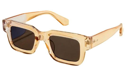 Gafas de sol con montura beige minimalista y cristales oscuros. Combinación suave y moderna para el día a día.