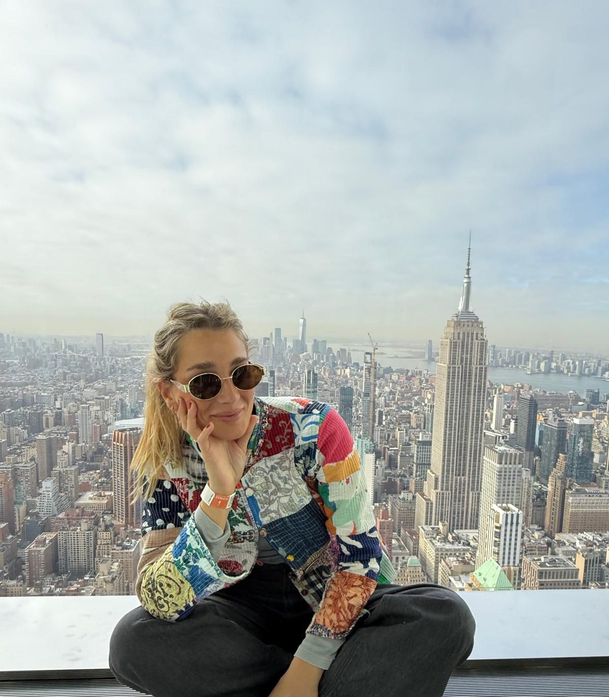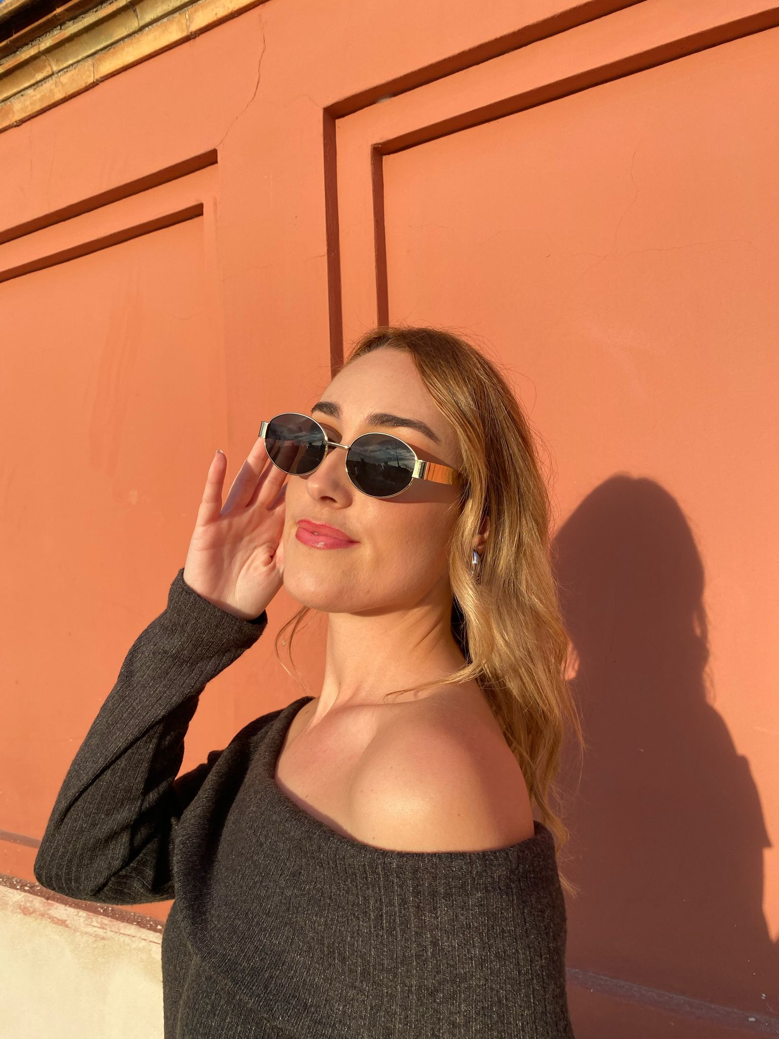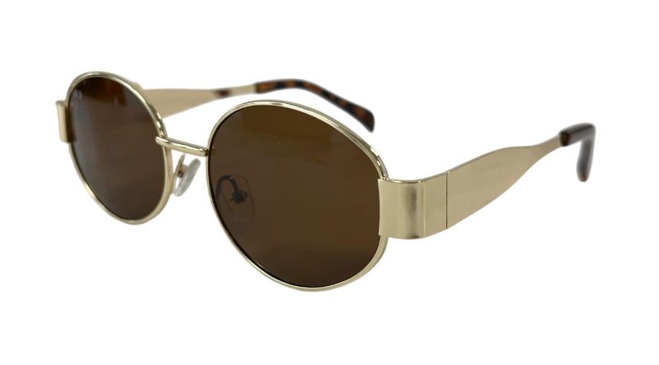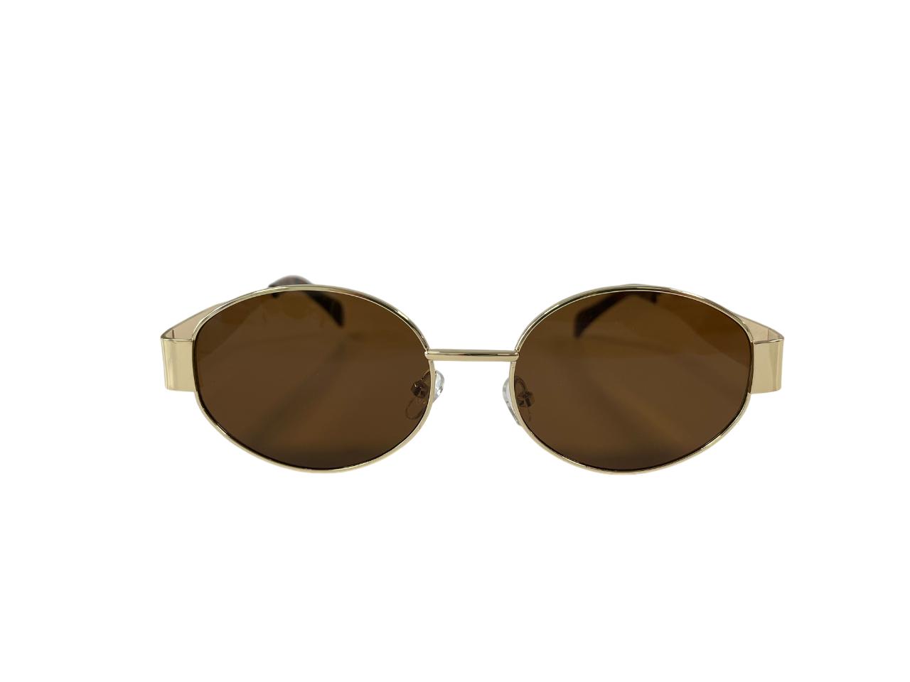 Gafas de sol con lentes redondas en un tono caramelo y una montura metálica dorada. Las patillas son también doradas y tienen una ligera curva en los extremos para mayor comodidad. Diseño elegante y moderno, ideal para un look sofisticado.