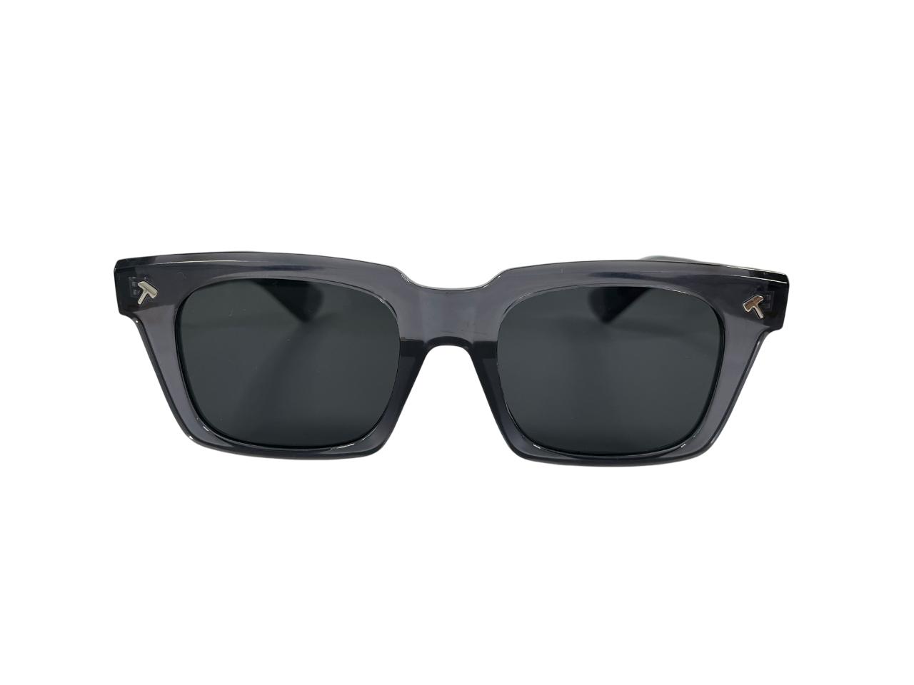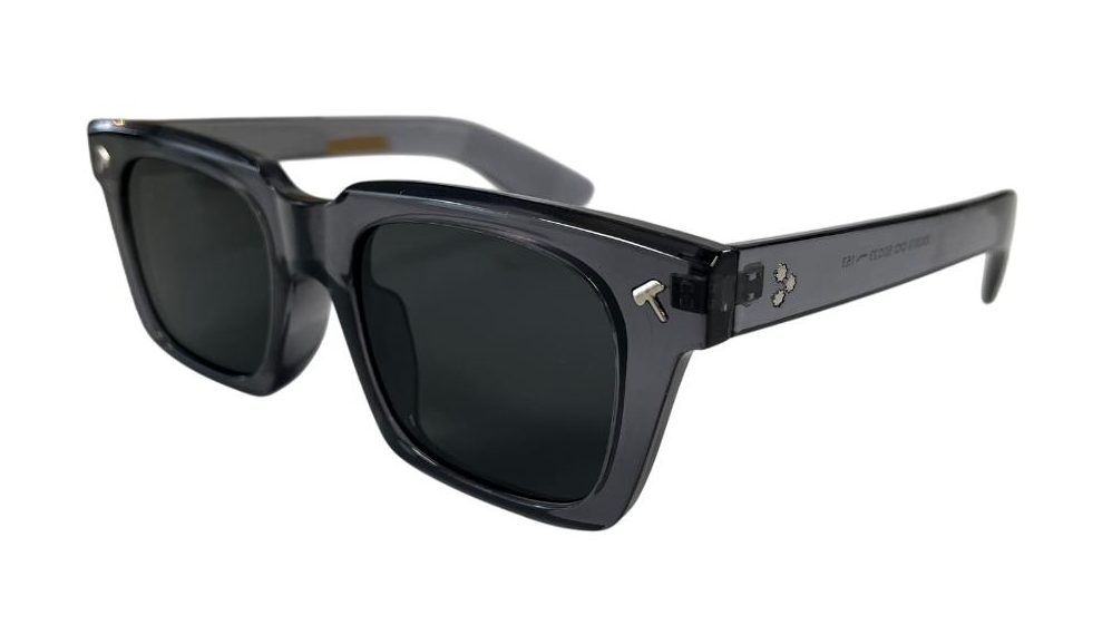 Gafas de sol grises con montura rectangular transparente y lentes oscuras. Diseño clásico y elegante, perfecto para un look sofisticado.