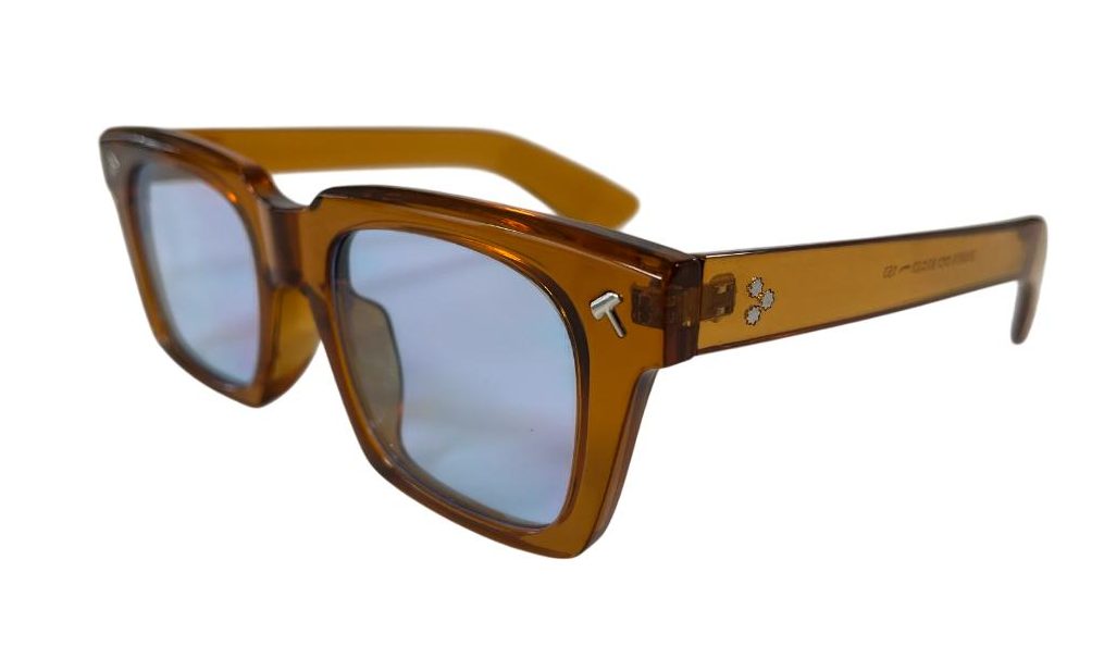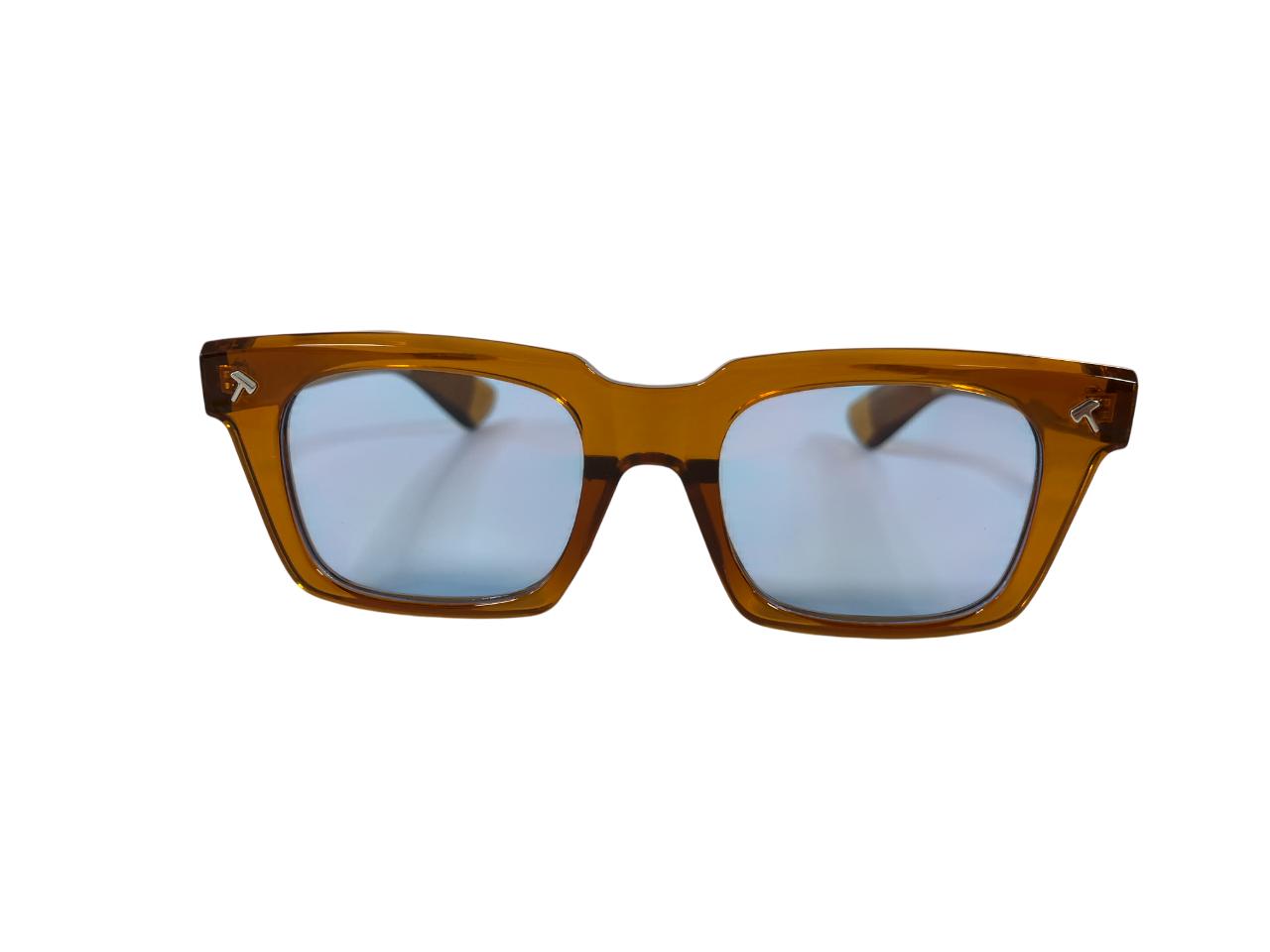Gafas de sol con montura marrón y lentes tintadas en azul. Diseño moderno y con detalles de marca distintivos.
