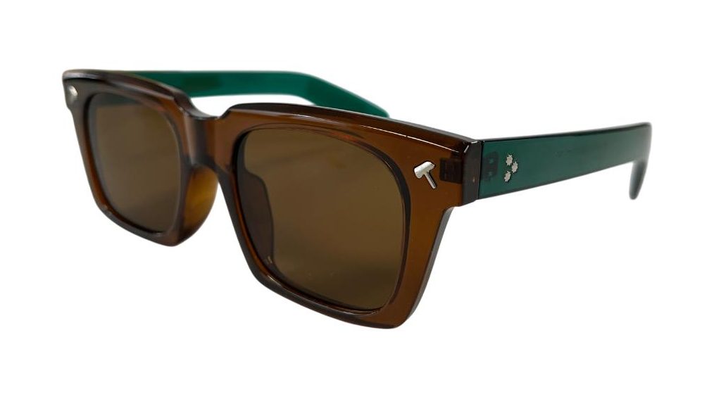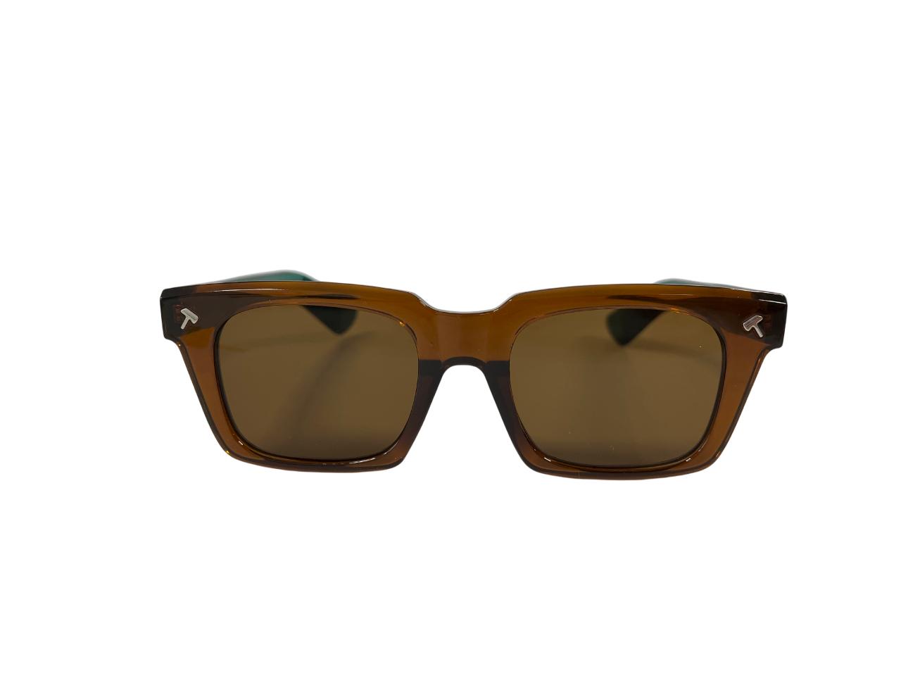 Gafas de sol con montura marrón, lentes en tono caramelo y patillas verdes. Diseño moderno y estiloso.