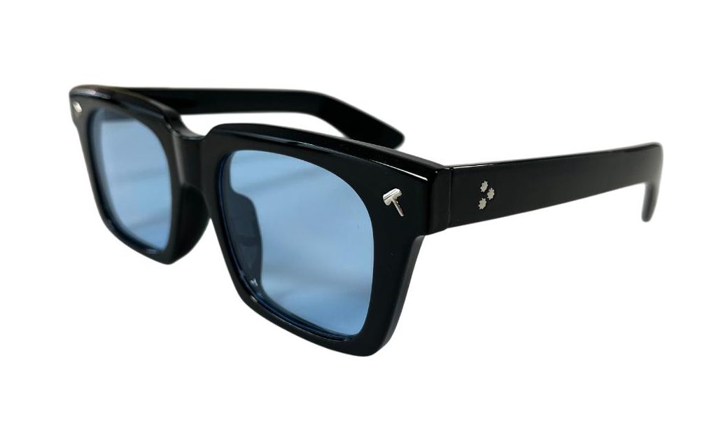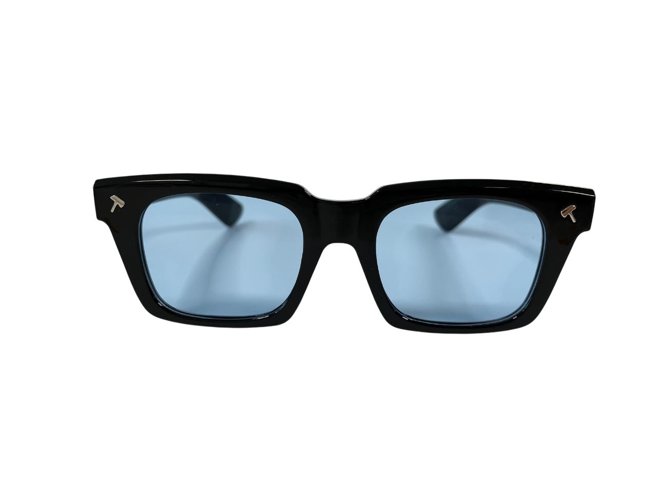 Gafas de sol con montura negra y lentes tintadas en azul. La montura es rectangular con un diseño grueso, moderno y estiloso.