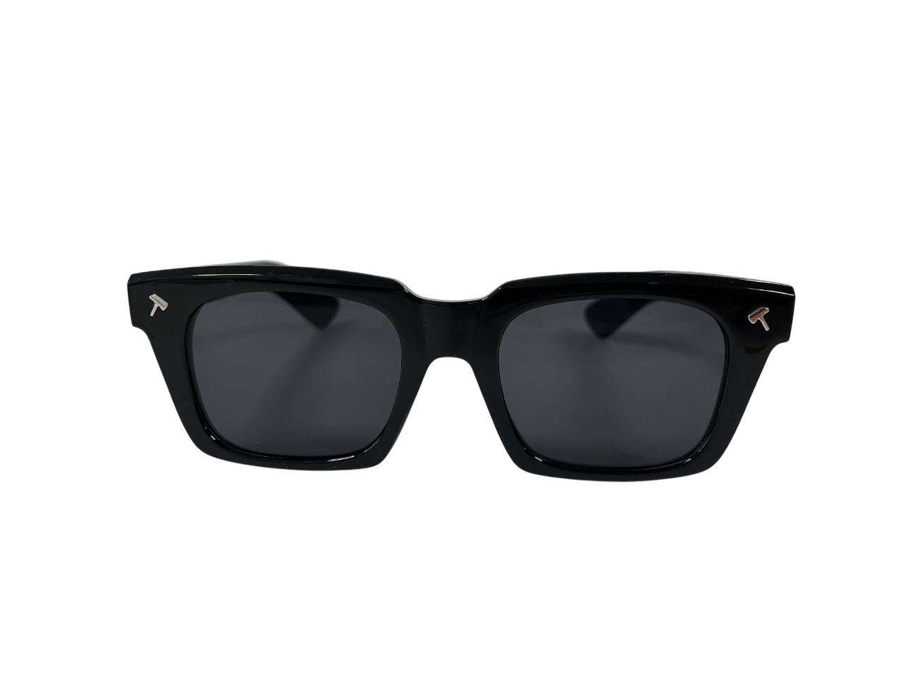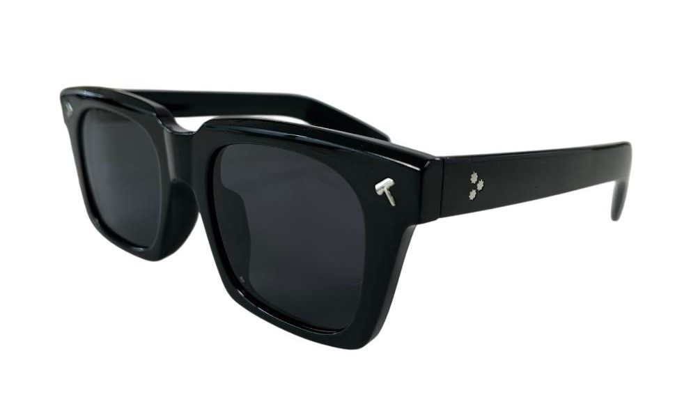 Gafas de sol negras con lentes oscuras. La montura es gruesa y brillante. Diseño clásico y elegante.