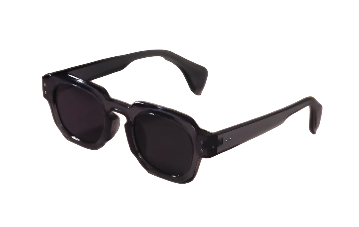 Gafas de sol grises con montura gruesa y lentes oscuras. La montura tiene forma rectangular con bordes ligeramente redondeados y las patillas son gruesas y rectas, curvándose en los extremos para un ajuste cómodo. Diseño elegante y moderno, perfecto para cualquier ocasión.